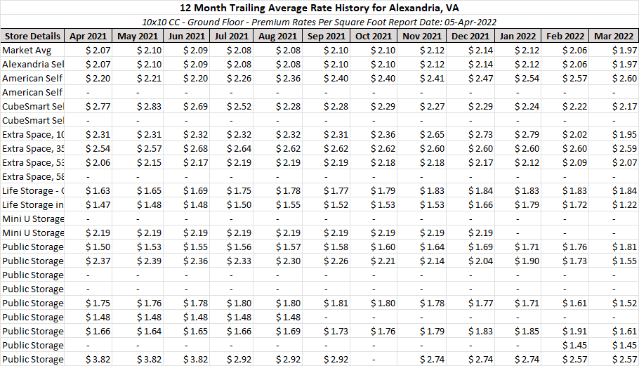 Throughout the past 12 months, all facilities in this market have consistently had higher rental rate per square foot averages for a ground floor, non-climated controlled 10 x 10 unit than the national average of $1.22 and a statewide average of $1.30 (see figure 1).